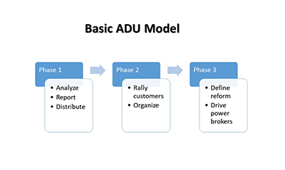 The three phase model defined by and for ADU is unique and action oriented, making it a good compliment to other think tanks.